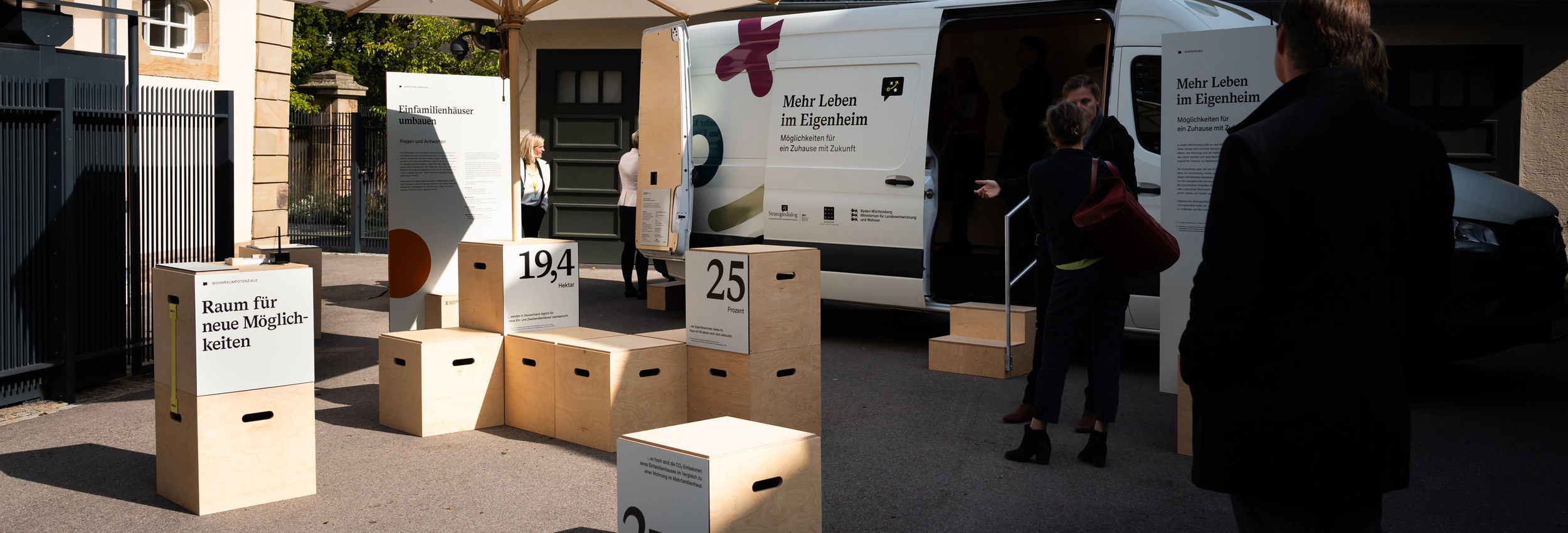 „Mehr Leben im Eigenheim – Möglichkeiten für ein Zuhause mit Zukunft.“ Diese Ausstellung wandert derzeit durch Baden-Württemberg, gefördert vom Ministerium für Landesentwicklung und Wohnen. Konzepte und Inhalte haben die beiden Stadtforscherinnen Verena Marie Loidl und Dr. Valerie Rehle gemeinsam mit Prof. Dr. Christina Simon-Philipp entwickelt. Sie knüpfen damit auch an ihre mehrjährige praxisbezogene Forschungsarbeit „Leben vor der Stadt. Einfamilienhäuser als Möglichkeitsräume“ an.
